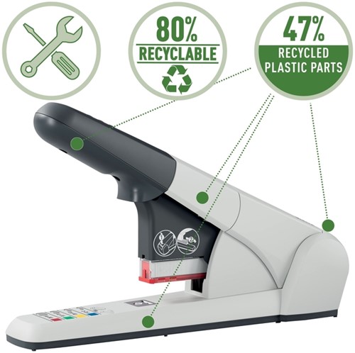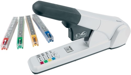 • Hoogwaardige Heavy Duty nietmachine met nietcassettesysteem voor het nauwkeurig nieten van 2-80 vellen papier (80 grams). Deze sterke en duurzame nietmachine wordt geleverd met 4 kleurgecodeerde nietcassettes die eenvoudig verwisseld kunnen worden met behulp van het voorlaadmechanisme. Ideaal voor op kantoor, in postkamers en andere gemeenschappelijke ruimtes. Je kunt één nietmachine gebruiken voor documenten van verschillende diktes door de cassette met de gewenste afmeting te selecteren en erin te plaatsen. Deze Heavy Duty nietmachine is gemaakt van metaal en een klein deel gerecyclede post-consumer plastic onderdelen en kan worden gerepareerd met reserveonderdelen om de levensduur van de nietmachine nog verder te verlengen. Aan het einde van zijn levensduur is het 80% recyclebaar wanneer het volledig gedemonteerd is in de verschillende materiaalsoorten om afval te verminderen en de hulpbronnen van de aarde te helpen behouden. De Leitz 5551 Heavy Duty nietmachine heeft een garantie van 10 jaar bij gebruik met Leitz nietjes en is GS-getest op veiligheid. Bijpassende producten zijn verkrijgbaar voor al jouw benodigdheden op het gebied van Heavy Duty nieten en perforeren.