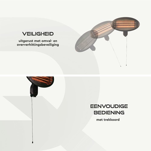 • De lamp heeft een afmeting van 50x36 cm en is uitgerust met 3 quartz verwarmingselementen. Deze buizen warmen direct op en zorgen voor een sfeervolle en aangename verlichting. Door middel van een trekkoord verwarm je met gemak en snelheid een ruimte tot 20m2. Met drie warmtestanden, die je regelt door middel van het trekkoord, van 650/1300/2000 watt kies je zelf hoe warm het wordt. Deze heater is geschikt om op te hangen aan plafond, muur of verkapping en makkelijk kantelbaar in de gewenste hoek. De terrasverwarmer wordt geleverd inclusief bevestigingsmaterialen. De terrasverwarmer heeft een automatische veiligheidsuitschakeling die de hem automatisch uitschakelt als het apparaat toch omvalt of wanneer deze oververhit raakt. Voor extra veiligheid is het verwarmingselement afgeschermd met een rooster, zodat de lampen niet per ongeluk aangeraakt kunnen worden. Voor alle liefhebbers van het buitenleven biedt de BRASQ Terrasverwarmer een war(m)e uitkomst.