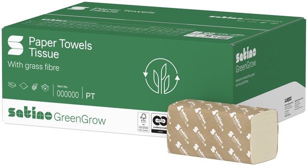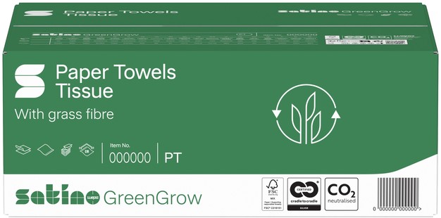 • Aantal vellen: 250 velSatino GreenGrow is hoogwaardig hygiënepapier met bijzonder duurzame eigenschappen. Producten uit deze productlijn wordt gemaakt van gerecycled papier, aangevuld met verse vezels van Miscanthus-gras. Deze grassoort wordt lokaal geteeld in West-Europa en de bodem wordt niet bemest, geploegd, bespoten of ingezaaid. Met een levensduur van vijftien tot twintig jaar lang groeit dit supergewas ieder jaar tot wel 4 meter hoog, waardoor het de bijnaam 'Olifantengras' heeft gekregen.