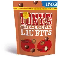 • Denk je aan Tony's, denk je natuurlijk aan.. karamel zeezout? Hoppa! Onze best verkochte reep, maar dan in het Lil'. Knapperige karamelstukjes met een dikke laag romige melkchocolade en een korreltje zout.. met ook nog een koekje d'r bij. Da's andere koek als je het ons vraagt. Enneh.. ook al zijn ze klein ze hebben grootse impact. Grabbelen maar!