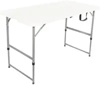 • Betrouwbaar, compact en lichtgewicht: De vouwtafel heeft een afmeting van 120x60x74 (lxbxh) en heeft 2 instelbare hoogtes, zo stel je hem eenvoudig in op 54 en 74 cm hoogte. Perfect voor zowel kleine appartementen als grotere evenementenruimtes. Hij heeft een sterk stalen frame met buizen met een doorsnede van 25mm. Door het lichtgewicht honingraat design weegt de vouwtafel slechts 8,5 kg. Deze inklapbare tafel is gemaakt uit robuuste materialen wat zorgt voor een kwalitatief product, en is daarom zowel binnen als buiten te gebruiken. Dit komt de maximale draaglast ten goede (max 80kg). De opvouwbare tafel is gemaakt van HDPE kunststof en bevat gerecyclede materialen. Mede hierdoor heeft het blad van de tafel een gemêleerde witte kleur (deze is dus niet effen wit).