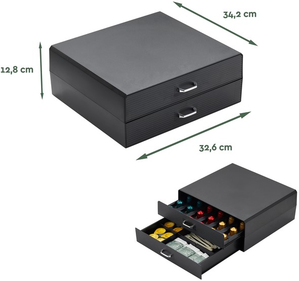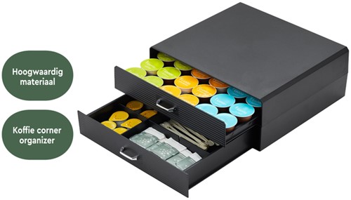 • Altijd zoeken naar een koffiecup? De hele la vol maar alle smaken en soorten door elkaar? De BRASQ Koffiecapsulehouder met 2 lades zorgt ervoor dat al je cups en accessoires netjes georganiseerd voor het pakken liggen. Maar ook alle overige koffie- en thee benodigdheden, zoals suiker- en roerstaafjes en melk, heb je alles overzichtelijk bij de hand. De praktische koffiecuphouder past perfect in de koffiecorner van een autogarage, een badkamershowroom of op kantoor. Maar zeker ook in de keuken van je eigen woning kun je de houder eenvoudig onder of naast je koffiemachine plaatsen. De capsulehouder heeft 1 grote onderlade, met vakverdeling, en daarboven 1 lade zonder vakverdeling. Samen bieden ze plaats aan 50 cups Nespresso of 30 K-cup of Vertuo cups. Dankzij de vorm kun je de cuphouder perfect onder je koffiezetapparaat bewaren, zodat je ruimte in de keuken bespaart.