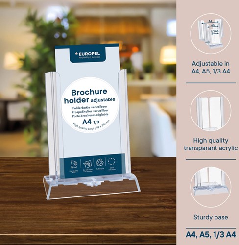 • Het Europel verstelbare folderbakje is de perfecte oplossing voor het presenteren van brochures, folders en flyers. Dankzij het verstelbare ontwerp is het geschikt voor diverse formaten, zoals A4, A5 en 1/3 A4. Belangrijkste kenmerken: