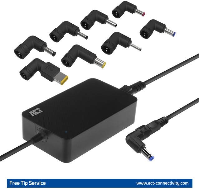 • Gratis tip service. ACT levert 8 plugjes/tips mee met de AC2055 Notebook Charger. Deze 8 tips zijn geschikt voor de meest gebruikte laptops. Heb je toch een andere plug nodig? Geen probleem! Vraag via onze website een gratis plug aan.