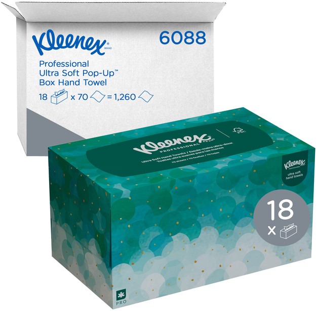 • Verbeter uw sanitaire ervaring met het vertrouwde en vertrouwde merk Kleenex®, ontworpen om een ongeëvenaarde ervaring te bieden en tegelijkertijd hoge hygiënenormen op de werkplek te ondersteunen. Kleenex® Ultra zachte Pop-Up papieren Handdoekjes zijn de essentiële luxe, zachte, sterke en absorberende 1-laags handdoeken voor bedrijven met een hoogwaardig imago. Deze luxe, Ultra zachte handdoeken die de hygiëne bevorderen, comfort en verzorging verrijken, zijn verpakt in een spatbestendige doos voor op het werkblad. Het slimme, in elkaar gevouwen ontwerp zorgt ervoor dat er telkens een enkele papieren handdoek wordt afgegeven zodat ze alleen worden aangeraakt door de gebruiker en het vermindert rommel en verspilling.