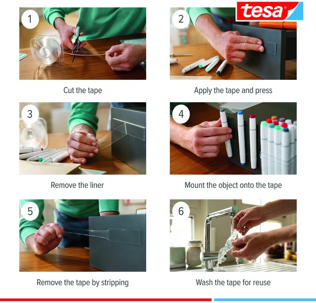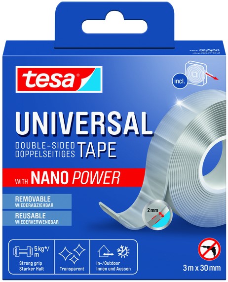 • tesa® Universal Nanotape blinkt uit door de grote veelzijdigheid, de sterke draagkracht en is bovendien herbruikbaar.