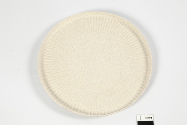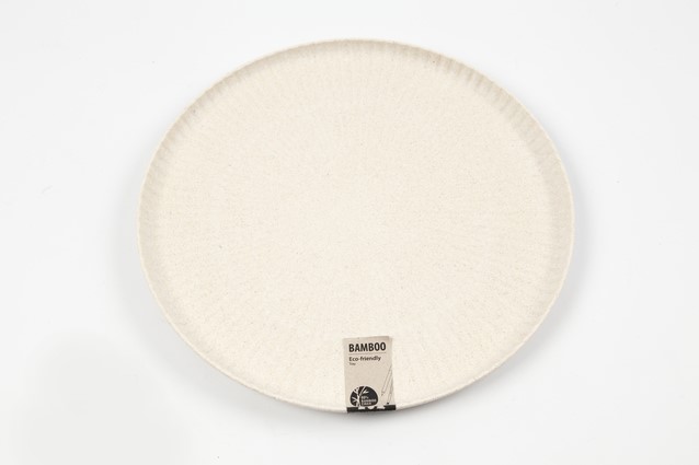 Rond dienblad met een diameter van 30cm en een geplooid patroon gemaakt van bamboevezels. Bamboe vezel met 20% polymeerbindmiddel is een milieuvriendelijk product dat eenvoudig gedecoreerd kan worden met acrylverf, porseleinstiften, enz. Vorstbestendig tot -21° C  . Hoogte rand: 2cm.