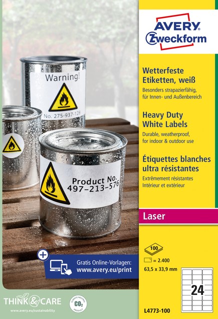 Label 63,5 x33,9mm weerbestendig permanent. Weerbestendige etiketten perfect voor gebruik buitenshuisSterke polyester etiketten, voor wanneer u wat sterkers nodig heeft dan papierWeerbestendig en watervast, kan niet scheuren. Vuil, olie en UV-bestendig en wordt niet beïnvloed door temperatuurwisselingen tussen -20 tot + 80 °CVoor extra sterke en langdurige hechtingGebruik gratis Avery's Design & Print Online software of Word templates om uw etiketten snel en eenvoudig te printen