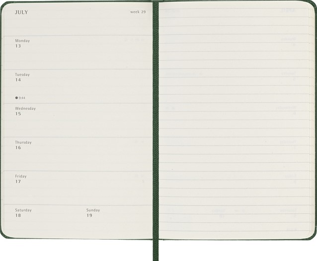 De Moleskine Weekly Notebook Planner is gedateerd van januari tot december. Het is een handige en veelzijdige planner die de vrijheid van een notitieboekje bevat en is ingedeeld met de afspraken van de week aan de linkerkant en een gelinieerde pagina voor notities op de rechter bladzijde. Het notitieboekje is beschikbaar met een harde of een zachte kaft met afgeronde hoeken en een elastische sluiting. - Harde kaft - Afgeronde hoeken - Elastische sluiting - Moleskine ivoorkleurig papier - Papiergewicht: 70 g/m² - Handige tools: planning, tijdzones, internationale metingen, toegangscodes en vluchtduur - Uitbreidbaar binnenvak passend bij de kleur van het notebook - "In geval van verlies" label gedrukt op het schutblad - Bijpassende bladwijzer voor lint - Herbruikbare paperband B-SIDE met extra gedrukte tools - 180° liggende opening - Moleskine srl. creëert en verkoopt FSC-gecertificeerde producten