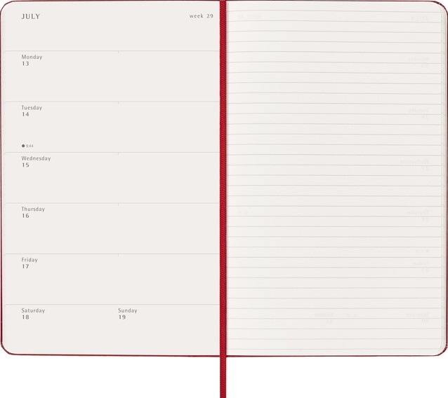 De Moleskine Weekly Notebook Planner is gedateerd van januari tot december. Het is een handige en veelzijdige planner die de vrijheid van een notitieboekje bevat en is ingedeeld met de afspraken van de week aan de linkerkant en een gelinieerde pagina voor notities op de rechter bladzijde. Het notitieboekje is beschikbaar met een harde of een zachte kaft met afgeronde hoeken en een elastische sluiting.