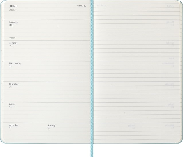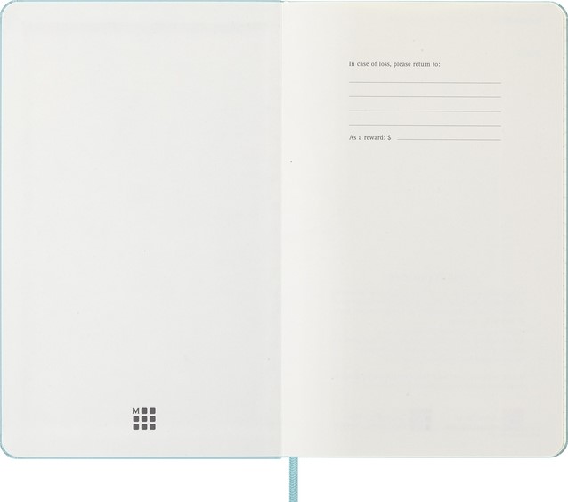 De Moleskine Weekly Notebook Planner is gedateerd van januari tot december. Het is een handige en veelzijdige planner die de vrijheid van een notitieboekje bevat en is ingedeeld met de afspraken van de week aan de linkerkant en een gelinieerde pagina voor notities op de rechter bladzijde. Het notitieboekje is beschikbaar met een harde of een zachte kaft met afgeronde hoeken en een elastische sluiting. - Harde kaft - Afgeronde hoeken - Elastische sluiting - Moleskine ivoorkleurig papier - Papiergewicht: 70 g/m² - Handige tools: planning, tijdzones, internationale metingen, toegangscodes en vluchtduur - Uitbreidbaar binnenvak passend bij de kleur van het notebook - "In geval van verlies" label gedrukt op het schutblad - Bijpassende bladwijzer voor lint - Herbruikbare paperband B-SIDE met extra gedrukte tools - 180° liggende opening - Moleskine srl. creëert en verkoopt FSC-gecertificeerde producten