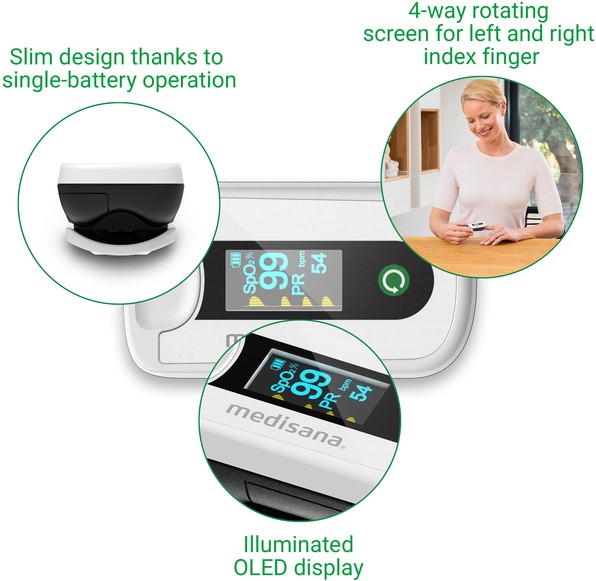 • Met de PM 180 pulsoximeter van medisana kunnen de zuurstofverzadiging in het bloed en de hartslag (polsslag) snel en nauwkeurig worden gemeten. Dankzij de eenvoudige bediening, het lage gewicht en het slanke ontwerp is het een handige manier om de belangrijkste vitale functies altijd in de gaten te houden - ideaal voor regelmatige gezondheidscontroles thuis of onderweg.