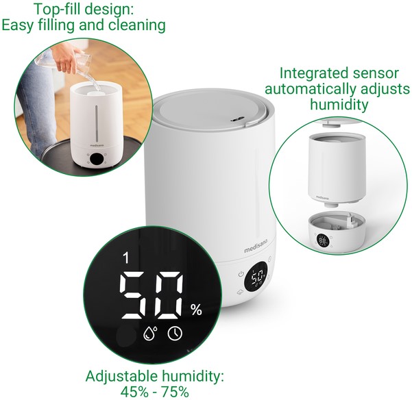 • De lucht in de ruimte wordt efficiënt bevochtigd met ultrasone technologie, terwijl een geïntegreerde sensor constant de luchtkwaliteit controleert en aanpast aan de individuele behoeften. Het LED-display met aanraakbediening kan worden gebruikt om de luchtvochtigheid in te stellen tussen 45%-75% en de bevochtigingsintensiteit in drie fasen. Alle waarden kunnen eenvoudig worden afgelezen van de geïntegreerde hygrometer.