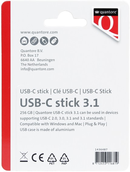 • Sla je bestanden snel en eenvoudig op met de USB-C-stick van Quantore. Met 256GB opslagcapaciteit en USB 3.1-technologie biedt deze stick hoge lees- en schrijfsnelheden, ideaal voor het overzetten van documenten, foto's en video's. De compacte, lichtgewicht behuizing is gemaakt van stevig aluminium en voorzien van een beschermkapje voor extra duurzaamheid. Dankzij Plug & Play is de USB-stick direct klaar voor gebruik op zowel Windows- als Mac-apparaten en compatibel met USB 3.1, 3.0 en 2.0. Kenmerken: