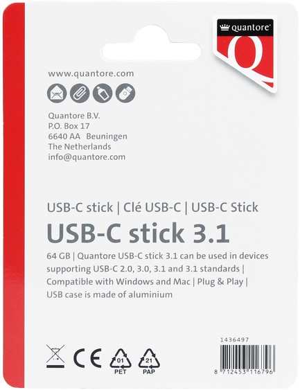 • Sla je bestanden snel en veilig op met de USB-C-stick van Quantore. Met 64GB opslagcapaciteit en USB 3.1-technologie biedt deze stick hoge lees- en schrijfsnelheden, ideaal voor het overzetten van documenten, foto's en video's. De compacte, lichtgewicht behuizing is gemaakt van stevig aluminium en voorzien van een beschermkapje voor extra duurzaamheid. Dankzij Plug & Play is de USB-stick direct klaar voor gebruik op zowel Windows- als Mac-apparaten en compatibel met USB 3.1, 3.0 en 2.0. Kenmerken: