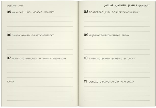 Met deze mooie 'Midnight Blush' Gradient agenda, hou je al je afspraken overzichtelijk bij de hand! Binnenin vind je telkens 7 dagen op 2 pagina's, een maandplanner en ruimte voor nota's, op crèmekleurig papier. Het binnenwerk is in het Nederlands, Frans, Duits en Engels. De harde kaft heeft een matte finish en een praktische elastische sluiting om alles op zijn plek te houden