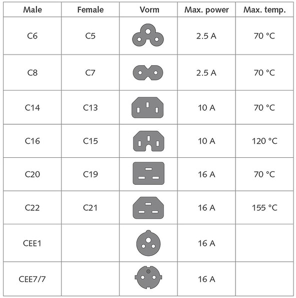 • Connectoren: Schuko CEE 7/7 male (haaks) - C13 IEC 60320.