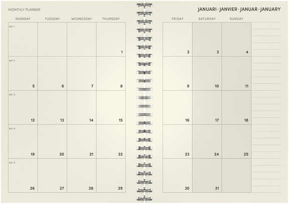 Dankzij de stevige metal wire-o binding blijft de planner perfect openliggen, en de elastische sluiting houdt alles netjes bij elkaar. De luxe matte afwerking met spot UV-details en crèmekleurige pagina’s geven deze planner een elegante uitstraling.