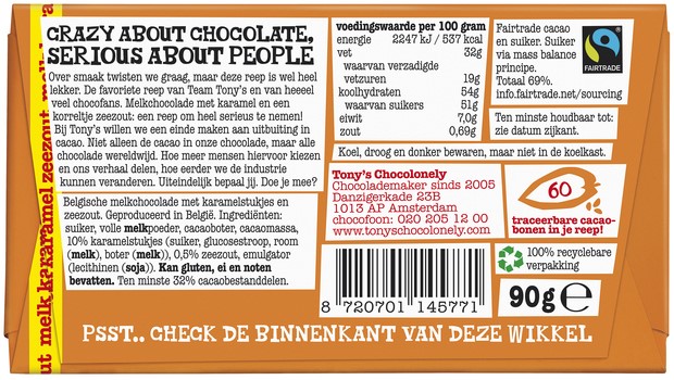 Over smaak twisten we graag, maar deze reep is wel heel lekker. De favorite reep van Team Tony's en van heeeel veel chocofans. Melkcholade met karamel een een korreltje zeezout: een reep om heel serieus te nemen. Nu in 'n kleiner reepje!