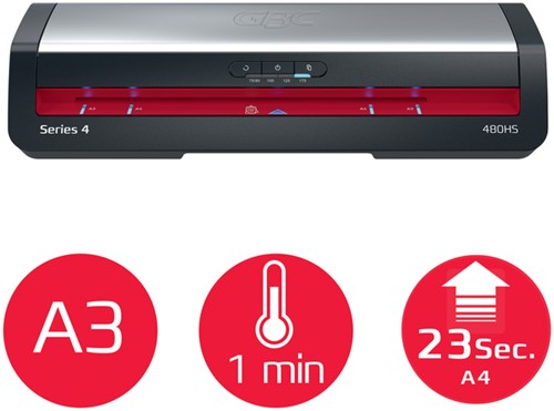 • Lamineert een A4 document (75 mic) in slechts 23 seconden. Lamineert 26x A4 in 10 minuten.