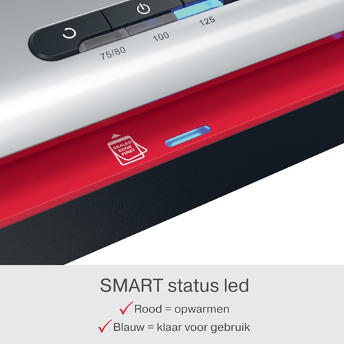 • SMART status led: brandt rood tijdens het opwarmen en wordt blauw met een geluidssignaal wanneer de lamineermachine klaar is voor gebruik.