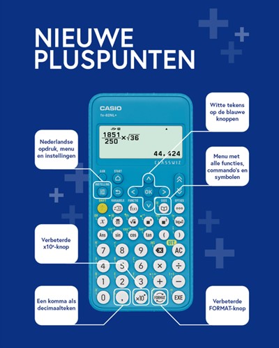 • De fx-82NL+ is een doorontwikkeling van de populaire fx-82NL en biedt diverse verbeteringen voor nog meer gebruiksgemak. Zo heeft deze nieuwe versie een Nederlandse opdruk en witte tekens op de blauwe navigatieknoppen en kun je sneller navigeren dankzij directe menu-keuzenummers. Ook nieuw: met SHIFT FORMAT zet je moeiteloos wiskundige notatie om naar een decimaal resultaat en andersom, en de x10?-knop maakt het eenvoudig om te werken met wetenschappelijke notatie. Daarnaast vind je via SHIFT GIDS een handig overzicht van alle functies, commando’s en symbolen – alles binnen handbereik.