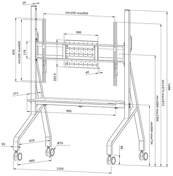 VESA patroon: 100x100, 100x150, 100x200, 120x120, 200x100, 200x200, 200x300, 200x400, 300x100, 300x200, 300x300, 350x350, 400x200, 400x300, 400x400, 400x500, 400x600, 500x400, 500x500, 600x200, 600x300, 600x400, 600x500, 600x600, 800x200, 800x400, 800x500, 800x600, 900x600 mm