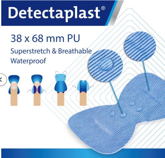 • Door zijn blauwe kleur valt de detecteerbare pleister op waardoor er minder kans is dat ze in de voedselketen terechtkomen.