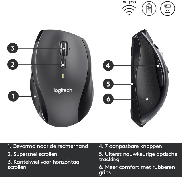 • De Logitech M705 Marathon is de draadloze muis die met gemak jarenlang meegaat – letterlijk. Dankzij een indrukwekkende batterijduur tot wel drie jaar werk je zorgeloos door zonder onderbrekingen (
