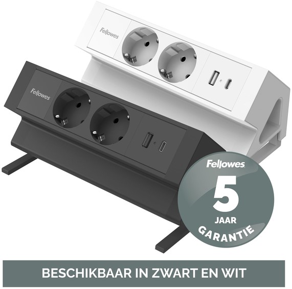 Stekkerdoos Fellowes Power Desk UP zwart, 2x 230V + 1x USB-A + 1x USB-C, 1m kabel GST18 aansluiting