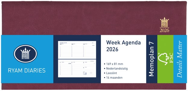 Agenda 2026 Ryam Memoplan 7 Mundior 7dagen/2pagina's landscape bordeaux