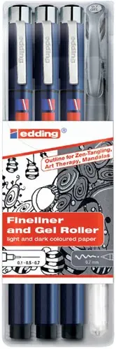 • Inhoud van de set: 3 x edding 1800 (in metaal gevatte ronde punt, schrijfbreedte: 0.1, 0.5, 0.7) zwart en een e-2185 gelroller metallic zilver metaalgevatte punt met een schrijfbreedte van 0,7 mm.