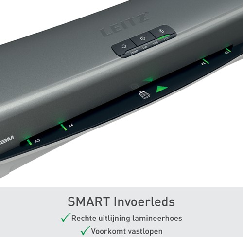 • SMART invoerleds: zorgen ervoor dat hoezen recht door de lamineermachine worden gevoerd om vastlopen te voorkomen.