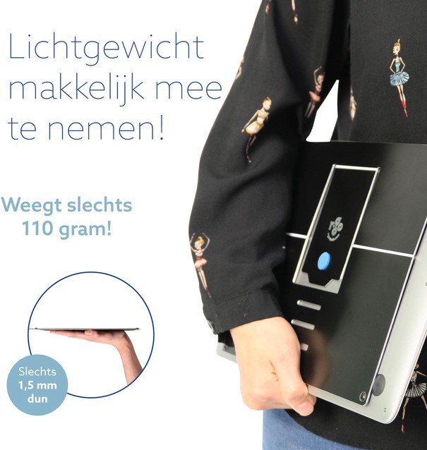 • De R-Go Riser Attachable laptopstandaard is een ergonomische aanvulling op elke laptop. Deze laptopstandaard van vliegtuigaluminium is slechts 1,2 mm dik. Hij brengt je laptop snel en eenvoudig op de gewenste hoogte en is verstelbaar in 4 standen. De R-Go Riser is ultra dun en licht van gewicht. Omdat hij vastzit aan je laptop, zul je de standaard nooit vergeten om mee te nemen. Zo werk je overal in een gezonde houding!