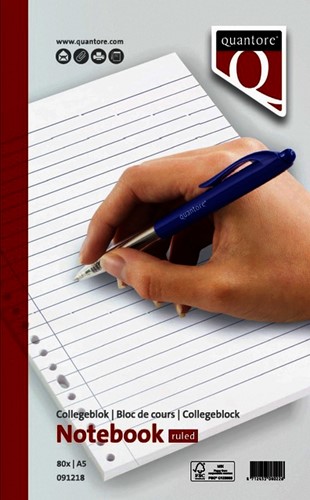 • Het Quantore A5 collegeblok is een compacte en handige keuze voor al je notities. Met 80 vellen gelinieerd papier van 70 grams heb je voldoende ruimte voor je aantekeningen, terwijl de microperforatie ervoor zorgt dat je pagina's gemakkelijk en netjes kunt uitscheuren. De 17-gaats perforatie maakt dit blok ideaal voor gebruik in kleinere ordners en ringbanden. De zijspiraal biedt extra flexibiliteit en gebruiksgemak, zodat je het blok gemakkelijk kunt omslaan. Vervaardigd uit FSC-gecertificeerde grondstoffen, kies je met dit collegeblok voor een milieuvriendelijk product zonder concessies aan de kwaliteit. Kenmerken: