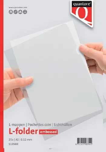 • De Quantore L-model insteekmap in A5-formaat is een handige en betrouwbare oplossing voor het beschermen en ordenen van kleinere documenten. Deze transparante map is vervaardigd uit polypropyleen met nerfstructuur en heeft een dikte van 0,12mm (120 micron), wat zorgt voor een stevige en duurzame kwaliteit. De boven- en rechterzijde zijn open, zodat je documenten gemakkelijk kunt in- en uitnemen. Dankzij de copysafe-eigenschap blijven afdrukken helder, zonder verkleuring of vastplakken.Kenmerken: