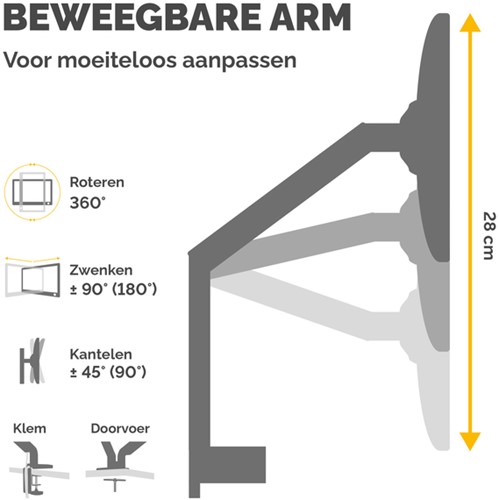 • Volledig onafhankelijk beweegbare monitorarmen voor het gebruik van twee beeldschermen.