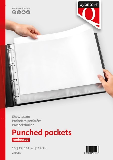 • De Quantore showtas in A3-formaat is ideaal voor het overzichtelijk presenteren en opbergen van liggende documenten. Gemaakt van transparant polypropyleen met een fijne nerfstructuur en een dikte van 0,08 mm, biedt deze tas een goede bescherming tegen vuil, stof en beschadiging. De bovenzijde is open, zodat je documenten eenvoudig kunt in- en uithalen. Dankzij de 11 versterkte ponsgaten is de showtas geschikt voor vrijwel elk ringbandmechaniek. Kenmerken: