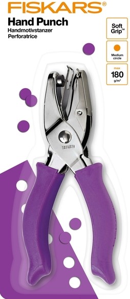 • Paarse, medium Fiskars handpuncher van roestvrij staal met SoftGrip handvaten.