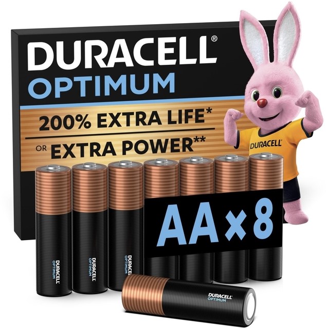 • De nieuwe Duracell Optimum alkalinebatterij met de meest baanbrekende Duracell-technologie ooit heeft een nieuw kathodesysteem dat sommige apparaten tot 200% extra levensduur, of andere apparaten extra vermogen biedt kracht geeft