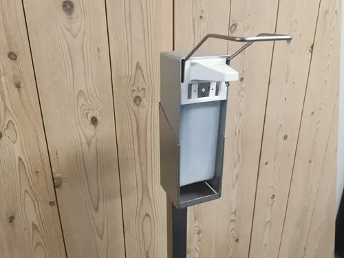 Desinfectiezuil RVS paal 130cm + aluminium dispenser met lange beugel