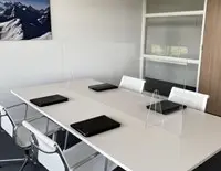 Dit preventiescherm maakt het in (vergader)ruimtes voor mensen mogelijk om op een veilige en zekere manier tegenover elkaar te werken en te communiceren.