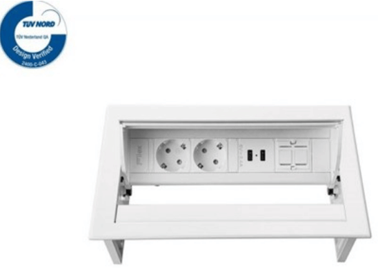 De Filex Power Desk In, is de nieuwe elektrificatie inbouwunit met een moderne uitstraling en kan verzonken worden in uw bureau. De Desk-in voorzien van een afdeklepje welke met een simpele vingerdruk zacht traploos geopend wordt of dicht gemaakt kan worden. De unit is eenvoudig te monteren en heeft een vast aansluitsnoer met een lengte van 1 meter met aan het eind een GST18 plug. De inbouwunit is uitgerust met 2 x 230V aansluiting, 2 x USB Charge en 1 x keystone (2 vrije posities) welke zijn in te vullen met bijvoorbeeld: data RJ 45, CAT 5 en CAT 6, USB 2.0/3.0, USB C, HDMI, VGA connectors of te gebruiken als kabeldoorvoer. Door deze configuratie heeft u zowel stroom voor uw laptop bij de hand, als voor uw telefoon en uw andere devices! Kleur: Wit. Tevens is deze Filex Power Desk In, inbouwunit nu ook TÜV gecertificeerd!