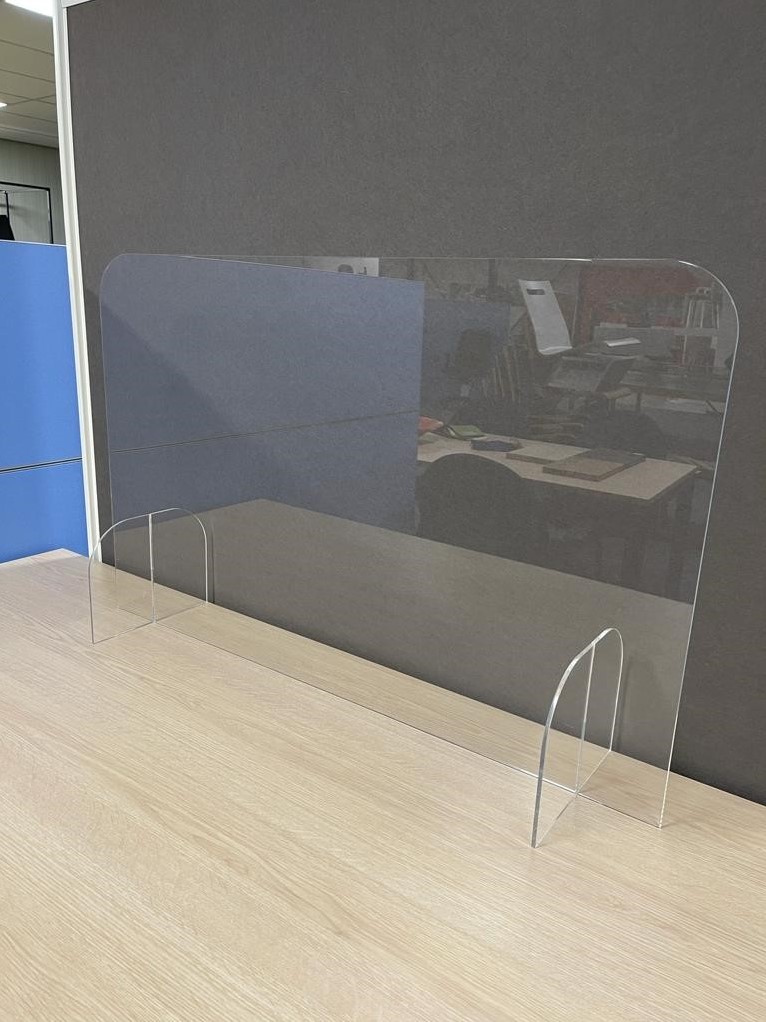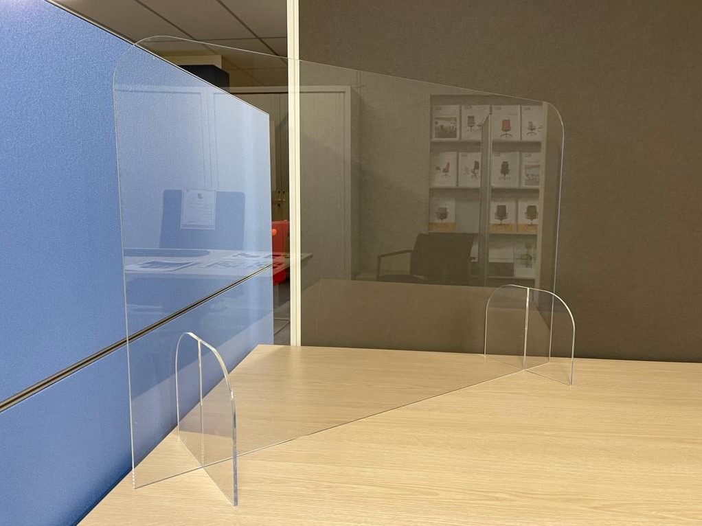 Dit preventiescherm maakt het in (vergader)ruimtes voor mensen mogelijk om op een veilige en zekere manier tegenover elkaar te werken en te communiceren.