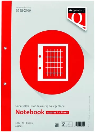 • Het Quantore A4 cursusblok met 4x8mm commercieel ruitjespapier is speciaal ontworpen voor precieze en overzichtelijke notities, perfect voor werk of studie. Met 100 vellen van 80 grams papier en een handige kantlijn, biedt dit blok meer dan genoeg ruimte om gestructureerde aantekeningen te maken. De 2-gaats perforatie maakt het eenvoudig om de vellen netjes in ordners op te bergen. De zijgelijmde binding houdt de pagina’s stevig op hun plaats, maar laat je ze ook gemakkelijk loshalen. Vervaardigd uit FSC-gecertificeerde grondstoffen, is dit een duurzame keuze die zowel praktisch als milieubewust is.Kenmerken:
