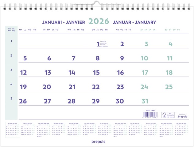 • 12 maanden: januari - december. 1 maand per pagina. Doordachte en functionele lay-out, voor een overzichtelijke planning. Volledige jaarplanning op het rugschild. 4-talig NL-F-GB-D. Met weeknummering. 12 pagina’s - inclusief internationale feestdagen. FSC agendapapier,  vlot beschrijfbaar. Met Wire-O metalen spiraalbinding.