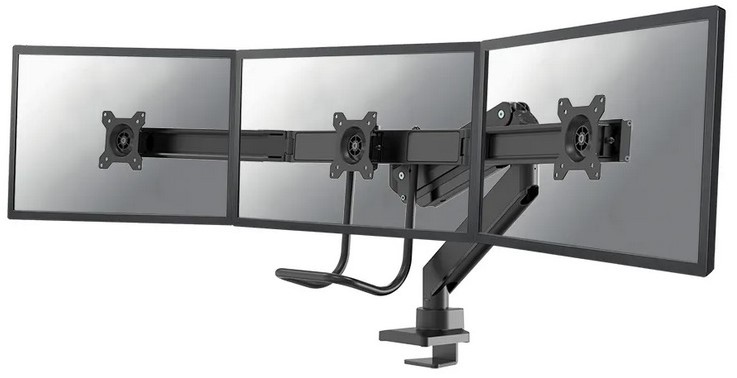 Met deze Neomounts Select monitorarm met hendel, model NM-D775DX3BLACK, bevestigt u drie flatscreens aan het bureau via een bureauklem.