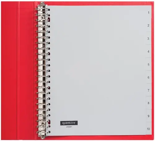 • De Quantore tabbladen 23-gaats 1-10 genummerd extra breed bieden een slimme en overzichtelijke oplossing voor het organiseren van je documenten. Deze extra brede tabbladen, met een formaat van 24,5 cm, zijn ideaal voor gebruik tussen showtassen of als aanvulling op standaard tabbladen. Ze zijn gemaakt van stevig grijs polypropyleen en ontworpen voor langdurig gebruik. De tabs zijn duidelijk genummerd van 1 tot 10 en passen dankzij de 23-gaats perforatie in vrijwel alle ordners en ringbanden. Perfect voor wie behoefte heeft aan extra zichtbaarheid en structuur.Kenmerken: