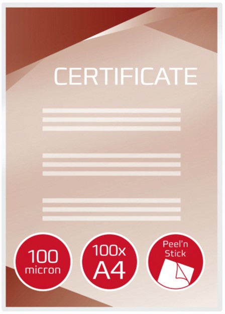 • Peel n' Stick-lamineerhoezen zijn ideaal om snel professionele, opvallende borden te maken. De kleeflaag hecht op de meeste materialen, waaronder glas, metaal en karton. U hoeft slechts het schutblad te verwijderen om de lamineerhoes op de gewenste ondergrond te plakken.