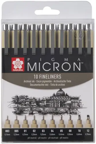 • Deze set bestaat uit 10 zwarte Pigma Micron-pennen met alle verkrijgbare puntdiktes uit dit assortiment: 1 x 003 (0,15mm), 1 x 005 (0,2mm), 1 x 01 (0,25mm), 1 x 02 (0,30mm), 1 x 03 (0,35mm), 1 x 04 (0,40mm) 1 x 05 (0,45mm), 1 x 08 (0,50mm), 1 x 10 (0,60 mm), 1x 12 (0,70mm).